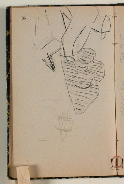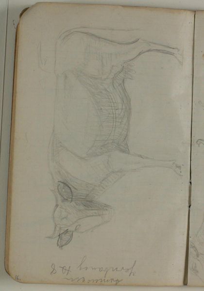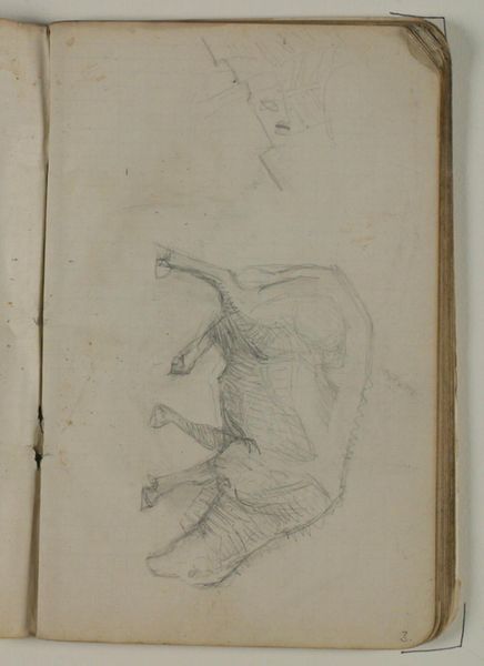 Curator: This intriguing sketch, "Skitser af køer. Udkast til monogram: SJ eller JS (Joakim Skovgaard)", or "Sketches of Cows. Draft for monogram: SJ or JS (Joakim Skovgaard)", comes to us from Niels Larsen Stevns, dating from about 1900 to 1905. Editor: The immediacy of the piece is what strikes me first—the hurried lines capturing a subject seemingly caught in motion. You feel like you're peering over the artist's shoulder as he attempts to distill raw life onto a page. Curator: Precisely. Stevns’ choice of pencil on paper offers a direct conduit to his creative process. This piece isn't just a drawing, but a glimpse into his methodology. It feels almost ephemeral. Editor: And the sketchbook quality adds a layer. These aren’t formal studies meant for display. These are working sketches. The very grain of the paper shows the artist's hand and emphasizes the labor behind representation, moving beyond the artistic "genius". The materiality—the humble pencil and paper—belies the deeper purpose of observation. Curator: A purpose evident in his rapid, searching lines. He circles and defines, trying to find the essence of "cowness" in a few strokes. Editor: Do you think the monogram attempt above the animal's back adds any value beyond the literal letters? Does the presence of text on the same plane mean he saw language and animal life as an exercise with a single purpose? Curator: Intriguing thought! Maybe for Stevns, these disparate elements converged in the act of observation. Capturing the spirit of a cow, in essence, became as symbolic as imbuing the artist's signature on the land itself. Or maybe the animals themselves serve as their own letters, forming abstract ideas like fertility and growth in the farmlands he called home. Editor: Hmm... I hadn't considered it that way. Perhaps both the animals and language are just tools—objects. Either way, "Skitser af køer" provides an exciting, rare chance to study an artist in action. Curator: Absolutely, a dance between intention, representation, and materiality on paper, indeed. Editor: I think that captures its spirit—or should I say, its matter—perfectly.
