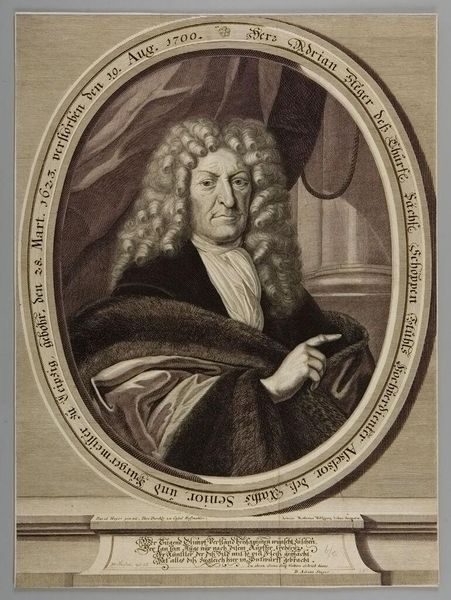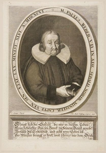 Editor: So, this is a portrait of Andreas Unglenkius by Andreas Matthäus Wolfgang. It's a detailed print. What strikes me is the incredible labor involved in its creation—all those tiny lines! What do you make of this piece? Curator: Notice how the artist uses line and form to create a sense of material wealth and intellectual status. The ruff, the gown, the book... all objects produced and consumed within a specific social context. Consider the labor required to create the paper, the ink, the printing plate itself. What does this tell us about the economics of art in Wolfgang’s time? Editor: I see. So, it's less about the individual and more about the systems that made the portrait possible? Curator: Precisely. And the networks of exchange it represents. Editor: Fascinating! It changes how I see the artwork completely.