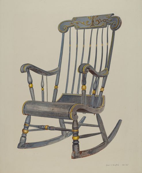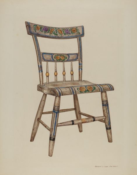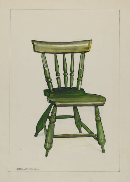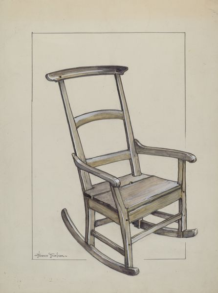Editor: Here we have Florence Truelson's "Red Pioneer Chair," made around 1937, a drawing rendered in watercolor. It seems quite stylized and, well, *red*. The chair looks like it could topple over. What do you see in this piece? Curator: Immediately, the focus is on the interplay of lines and shapes. Note how Truelson uses converging lines in the chair legs to create a sense of depth. The eye is drawn upwards along the curved arms and back, only to be abruptly stopped by that heavy horizontal seat. Editor: Yes, it's almost like a visual roadblock. And what about the color palette? The artist only uses reds, browns, and yellows. Curator: Indeed. Truelson employs a restricted palette, which accentuates the chair's form and texture. The brushstrokes suggest a deliberate attempt to capture the tactile qualities of wood. Consider, also, the yellow highlights that suggest the play of light across the surface, which adds a sculptural dimension to what is, ostensibly, a two-dimensional image. What is your interpretation of its semiotic meaning? Editor: I am not entirely sure. I mean the color creates a sense of warmth, maybe domesticity. Is the slight distortion supposed to indicate unease? Curator: Perhaps, or perhaps it is about focusing our attention on its geometric features. Notice how the ornate carving of the backrest juxtaposes with the rigidity of the rest of the chair’s form. Does that imply anything for you? Editor: It suggests a tension between decoration and function, maybe, a commentary on design principles? Curator: An interesting insight! Overall, it encourages us to look past the represented object and consider the elements that define our visual experience of it. Editor: This approach has changed my perspective. I appreciate its formalism now.
