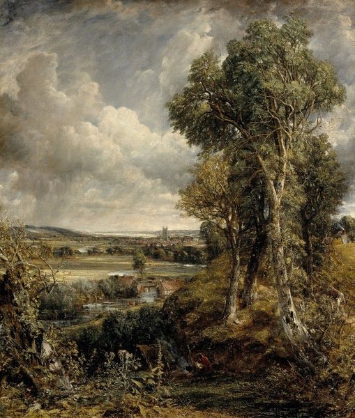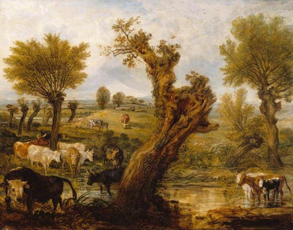 Curator: Look at "The Rainbow Landscape" painted around 1636 by Peter Paul Rubens, a stunning example of Flemish Baroque landscape painting. Editor: Wow. It's instantly calming, isn't it? The vastness mixed with those small human and animal figures... There's a sort of dreamy reverence, and those ducks in the foreground are a sweet touch! Curator: Consider Rubens’ access to the raw materials; the cost of the pigments, the canvas preparation—everything signals a patron of significant wealth, someone capable of supporting his artistic endeavors and accessing his networks for distribution. It isn't your average farm! Editor: True, but beyond the socio-economics, for me, it speaks to something timeless. Look how the rainbow kisses the horizon; it almost feels like a promise woven into the very fabric of the scene. It evokes that beautiful moment of hope when the storm breaks and reveals something new. Don't you think? Curator: Symbolism is key here. Consider the arc of the rainbow itself. It functions not just as a pretty picture, but as a signal of nature as bound with social elements – such as the work undertaken. Editor: And it all pulls together--the light reflecting in the water, the farmers at work... all connected by this vibrant band of color. Almost making you nostalgic for a simpler way of existing that never actually existed, eh? The landscape feels alive! It’s almost tangible. Curator: Its realism has impact, yes, which may derive from studying detailed works, although from the Italian Renaissance specifically. Note the detail afforded to common labourers in amongst an Arcadian idyll: that Rubens’ landscape can afford to pay attention to material labour. It brings with it its own questions! Editor: Exactly! It prompts us to find our place in that vast tableau—somewhere between awe and the everyday grind. It asks us to stop romanticizing an image without really diving in on the labour being put to it. Not bad for a few strokes of oil paint, eh? Curator: It underlines how paintings reflect both material conditions and cultural imaginaries, each stroke shaped by tangible realities as well as artistic intention. A reminder to dig deeper than surface impressions. Editor: Indeed! After analyzing, its beautiful but to truly digest such art in totality would take some serious thinking about context, time period, resources. You definitely gave me food for thought.