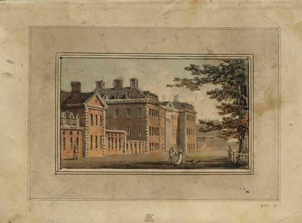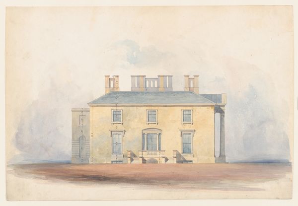 Editor: This drawing, “Design for a Classical Country House, Side Elevation,” made between 1800 and 1830 by an anonymous artist, utilizes watercolor, pen, and colored pencil. The understated color palette gives the architectural rendering a serene, almost dreamlike quality. What does this piece say about the culture it comes from? Curator: It speaks volumes, actually. Look at the symmetry, the clean lines, the imposing yet restrained classical elements. This is Neoclassicism in its architectural aspirations. It suggests a desire to associate with the perceived order and rationality of the Roman Republic. Do you notice how it elevates a private residence to something resembling a public monument? Editor: Yes, I see it. So, it's not just a house, it's making a statement about… power, maybe? And permanence? Curator: Precisely. Consider who would commission such a design. The wealthy, of course, but also those invested in maintaining a certain social order. This isn't just about shelter; it's about projecting an image of stability and authority, connecting themselves to historical ideas about civic virtue and control during times of rapid change during the industrial revolution. Why depict just the side, do you think? Editor: Maybe the side view emphasizes its connection to the landscape, like it's meant to blend in and dominate at the same time. Curator: Interesting thought. Remember that the control of land equaled political power. Visualizing this controlled perspective could imply ownership over all of that space. So the aesthetic is intrinsically bound up with sociopolitical concepts. Editor: It's fascinating to think about how buildings, even on paper, can be such loaded symbols. Curator: Indeed. By studying such designs, we can decode the values and ambitions of a bygone era and consider echoes in our present-day architecture. Editor: This perspective really helps to appreciate art, thinking of it more critically.