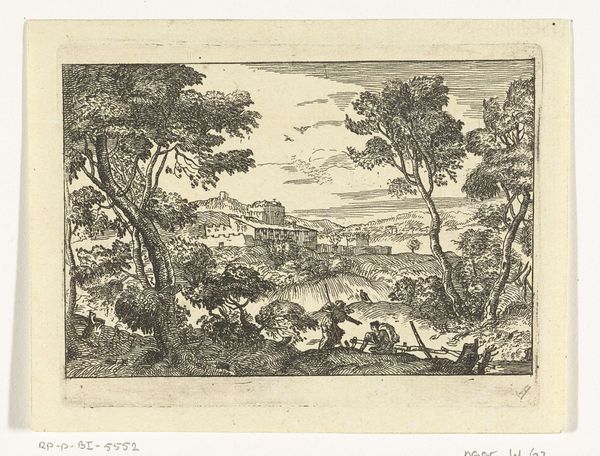 Jan van Almeloveen created this landscape with wanderers using etching, likely in the late 17th century. The process of etching involves covering a metal plate with a waxy ground, then scratching an image into that surface, exposing the metal beneath. The plate is then submerged in acid, which bites into the exposed lines, creating grooves. Ink is applied to the plate, filling these grooves, and the surface is wiped clean. Finally, the plate is pressed onto paper, transferring the inked image. The etched lines lend themselves to the detailed depiction of nature, from the leafy trees to the distant hills. The fine lines also allow for shading and depth. The printmaking process also allowed for the democratization of art, making images like this available to a broader audience. This was a time of increased urbanization and the rise of a merchant class, where art became a commodity, and prints like this one met the demands of a growing market.