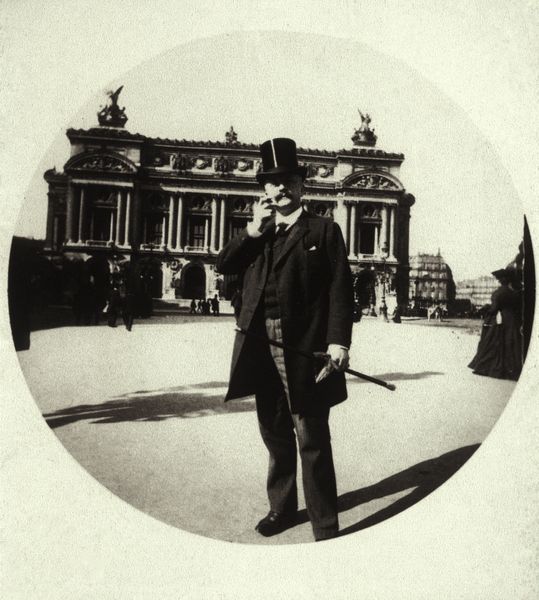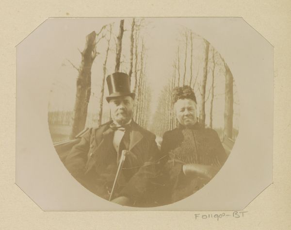 Editor: This is "Portret van een man met een peuter op de arm, vermoedelijk in Frankrijk," a photograph from 1903 housed in the Rijksmuseum. What strikes me is the intimate, yet formal setting. The sepia tones lend it an old-world charm. What stands out to you when you examine this piece? Curator: It’s fascinating to consider the chemical processes that enabled the creation of this photographic image in 1903. Sepia toning itself was a material choice, both aesthetic and practical – it improved archival stability. What do you think the act of creating this image might tell us about the social status of the subjects and the photographer? Editor: It makes you think about access to the means of image production, right? Was photography common? Was commissioning such a portrait costly, labor intensive? It definitely wasn’t democratized the way image-making is today. Curator: Precisely. Consider also the sitter's clothing, his bowler hat. And consider the baby's christening gown or bonnet, that suggests a certain level of craft and access to materials. Each element of material culture speaks to a specific social reality. What does it tell us about the consumption of photographic portraits at that time? Editor: Good question. These studio portraits were precious objects for families. Photography provided a new method of memorializing loved ones. People began to build extensive family photo albums that were prominently displayed in their homes. It was more about marking one's place in society through visual representation. I had not thought of the impact of display on constructing family narrative. Curator: So how might this particular photographic process and the materials involved influence our understanding of early 20th-century French society, beyond just a simple family portrait? Editor: Examining the material realities and photographic methods offers rich insights into the labor and socioeconomic contexts embedded within the image. That gives me so much to consider! Curator: Exactly. It prompts us to question whose stories are being told and how, and whose are absent.