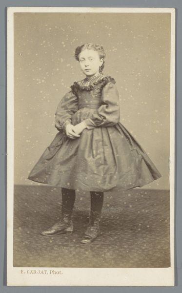 Johannes Laurens Theodorus Huijsen created this small portrait of an unknown girl, standing beside a desk, using photography, a relatively new medium at the time. During this period in the Netherlands, photography studios were becoming increasingly common, and portraits became a way for individuals to document their likeness and social standing. While the sitter's identity remains a mystery, her attire and the presence of a desk suggest a certain level of education and social status within the Dutch middle class. The girl’s gaze exudes both a vulnerability and a quiet strength. It gives us a glimpse into the life of a young girl navigating the expectations and limitations placed upon her by society. This portrait serves as a poignant reminder of the countless untold stories of individuals whose lives were shaped by the currents of history, while inviting us to reflect on the complexities of identity and representation.