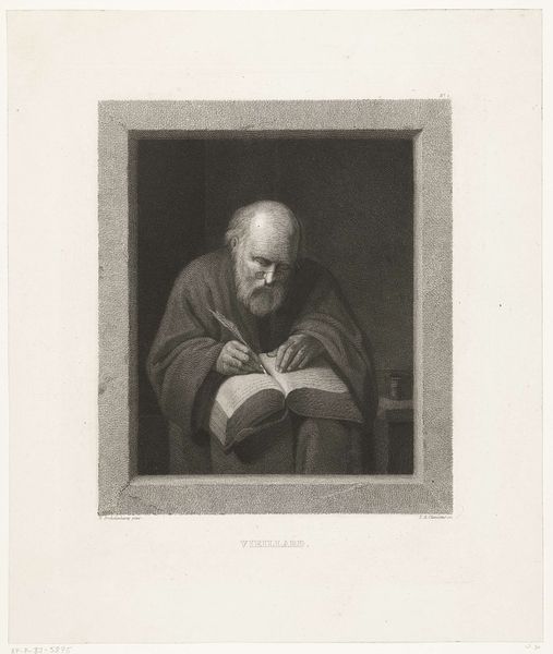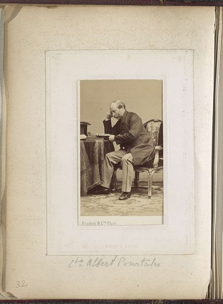 Curator: This is an untitled photograph by Antoine Samuel Adam-Salomon, often called "Monk Reading." Look closely at how the artist has used light to create drama. Editor: It feels heavy, doesn't it? Like mortality itself is weighing down the scene. The textures are amazing, and I feel like it tells a hidden story. Curator: The composition is quite deliberate, note how the skull intersects the monk's line of sight. It prompts a reading of vanitas and a semiotic analysis of life and death. Editor: True, and the skull on which the monk's hand rests…there’s such a stark contrast between living intellect and inert bone, a beautiful sort of tension. Curator: Indeed, the artist has arranged these elements so thoughtfully. The photograph becomes a meditation on knowledge and its limits. Editor: It leaves you pondering, doesn't it? A simple image holding profound questions. Curator: Precisely; it prompts the viewer to contemplate how time and knowledge intersect. Editor: A powerful and melancholic reflection.