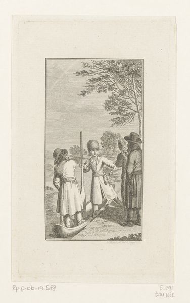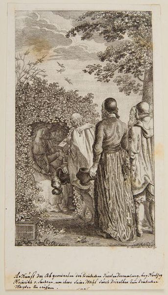 Daniel Nikolaus Chodowiecki made this print, Hendrik I ontvangt de broer van de overleden koning Koenraad I in zijn tuin, using etching. Chodowiecki lived through the Enlightenment, a period of social upheaval and philosophical change. This work illustrates a historic moment in a private encounter. A group of figures are gathered in a garden, a space that seems designed as much for privacy as for public display. What are the dynamics of power and negotiation being staged here? How is the setting – a garden, a space of cultivation and controlled nature – influencing these interactions? The artist focuses on the gestures and expressions of the figures. The image evokes questions about succession, legitimacy, and the personal dimensions of political life. Consider the role of such artworks in shaping public perceptions of historical events and figures during the Enlightenment.