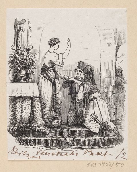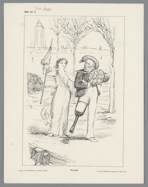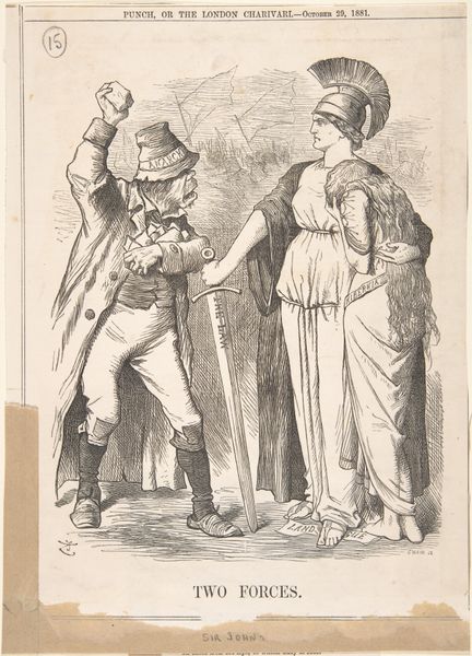 This political cartoon, "De boodschap van den Czaar," by H. van Ooijen, presents us with an allegorical scene rendered in meticulous line work. The composition unfolds with sharply defined characters set against a backdrop of classical ruins. The textures, achieved through cross-hatching, give depth to the figures. At the center, a female figure, presumably representing Europe, interacts with other characters, while a Russian bear recoils in the background. The artist uses a semiotic system of signs, and cultural codes to deliver his message. The classical garb of one figure may imply historical ties, while the bear can be seen as representing the Russian Empire. The globe labeled 'Europe' becomes a focal point, suggesting themes of geopolitical maneuvering. The cartoon challenges fixed meanings by destabilizing the viewer’s expectations. It prompts us to decode the artist's perspective on power, representation, and the relationships between nations during this time, and to reconsider the visual elements as part of a larger cultural discourse.