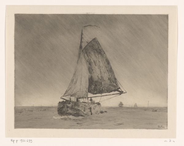 This print of a sailboat with a coastline in the background was made by Frans Hens using etching, a printmaking technique that gained traction in the nineteenth century. The image's velvety blacks and grays are the result of the artist drawing into a wax-coated metal plate with a sharp needle, exposing the metal beneath. Once the plate is submerged in acid, the drawn lines are eaten away. This process creates grooves that hold ink, which is then transferred to paper under great pressure, revealing the image. The network of lines in this work is a direct result of Hens's hand movements, giving the scene a sense of immediacy. Although the materials and techniques used in the making of this print are relatively simple, the resulting image is rich in texture and tone. It demonstrates how a craft, like etching, can be elevated to fine art.