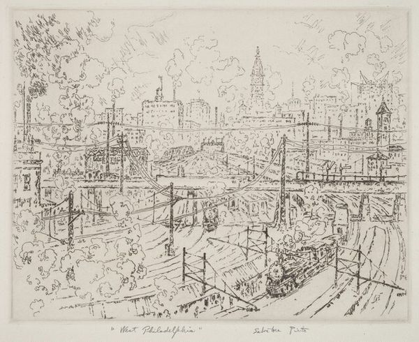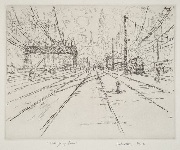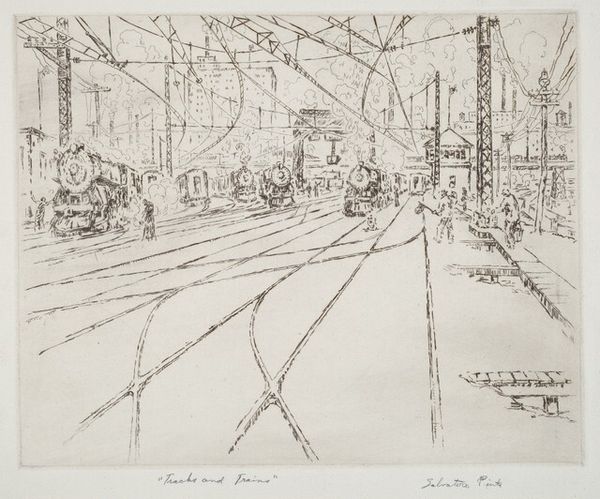 Salvatore Pinto’s etching, Overhead Wires, captures the industrialized landscape of the early to mid-twentieth century. Pinto, born in New York City to Italian immigrants, frequently depicted urban scenes. This print invites us to consider the intersection of progress and lived experience. The imposing architecture in the background is softened by the almost chaotic network of wires overhead, hinting at both the promise and the price of modernity. The figures in the scene, dwarfed by the machinery of progress, suggest the human element within this rapidly changing world. It encourages us to reflect on how technological advancement shapes our identities, our communities, and our relationships to one another. Does progress always equate to a better future?