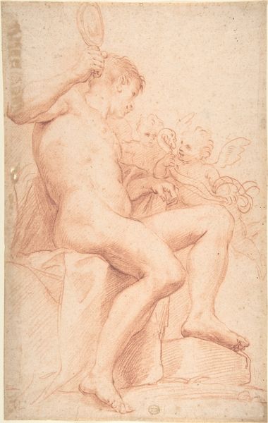 Curator: Immediately, I sense a dynamism in these figures, a tension held within the constraints of a single sheet. It almost feels like a snapshot of thought in motion. Editor: Indeed. This work, attributed to François Marot, is entitled "Sheet of Studies: Three Women and a Hand (recto); Sketches of Male Nudes, Heads and Hand (verso)". It offers a glimpse into the artist's process. There's an urgency here, rendered with pencil, chalk, and black chalk on paper, like Marot was trying to capture a fleeting moment or idea before it vanished. Curator: The female figures certainly evoke classical ideals, perhaps echoing the ancient goddesses and their inherent power. The symbolism of the reclining figure, and the supplicating stance of another... it speaks to an understanding of the symbolic language of form. Editor: And that very "ideal" is a construct worth dismantling, isn't it? Consider the gaze imposed, the vulnerability laid bare. The power isn’t in the form itself, but rather in how those forms have historically been used to reinforce societal hierarchies. Who benefits from perpetuating these images? The context always matters. Curator: Certainly, that's an essential reading. But consider the continuity. The artistic understanding that has echoed and shifted, as artistic depictions evolve. Even within your framework of imposed gaze, one could suggest that these depictions possess some autonomy; something about the way the medium responds gives a glimpse into something about Marot, his time, its conventions. Editor: I recognize the inherent desire to find beauty, or even meaning in the artist's engagement with those ideals, but I can't look away from their implications, then and now. These historical images continue to participate in current power structures. They still shape perspectives, intentionally or unintentionally, and that cannot be ignored. Curator: A valid point, the afterlives of images, how meanings drift. Looking again, this tension adds depth to the piece, and offers a complex conversation. The power of the art relies in that very tension. Editor: Agreed. Engaging with that visual dialectic lets us question our contemporary moment, and where our established perceptions of beauty, form, and representation actually originated. Thank you for expanding my view.