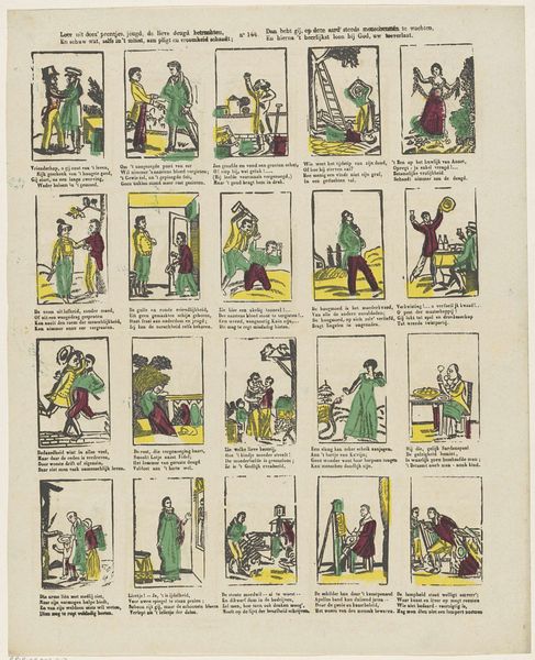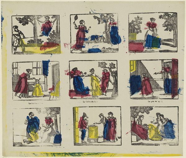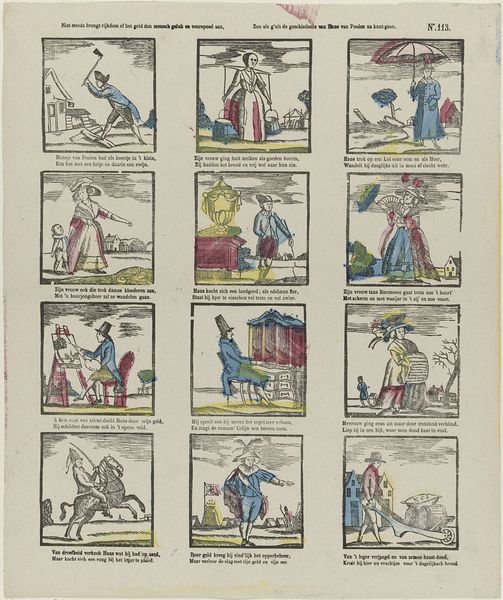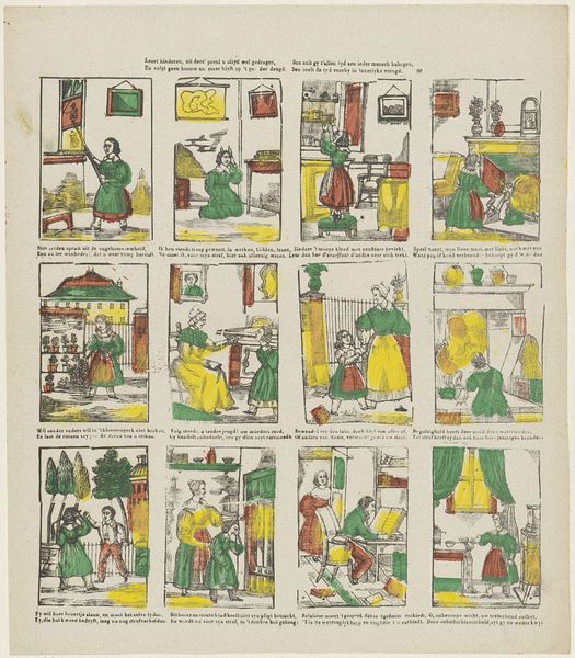 Curator: This work, titled "Beroepen, spelen en bezigheden", or "Occupations, games, and activities," presents a sequence of vignettes that are contained within the Rijksmuseum collection. Created sometime between 1827 and 1894 by M. Hemeleers-van Houter, this print utilizes the woodcut medium. Editor: My initial impression is how charmingly rudimentary these scenes appear. The constrained color palette and blocky forms imbue them with a naive quality. Each tableau, in its roughhewn simplicity, resonates. Curator: Absolutely. It's vital to acknowledge the socio-historical setting in which such a piece was created. Visual imagery during this period was pivotal for illustrating aspects of societal labor and customs to a wider public—before readily accessible photography and film. This was particularly relevant to print, which has often provided satirical caricatures for broader populations. Editor: The composition leans heavily on linear definition. Observe how outlines form the structure and then overlaying flat colors fill each segment, rather like the rudimentary methodology of a coloring book. It is this reduction to simple shapes that grants each little stage such character. Curator: True. And examining its placement within art history, you might find it resonating with styles prevalent in works of Ukiyo-e, specifically, its utilization of commonplace topics alongside an economy in line. It suggests an intriguing dialogue across continents. This form permitted wider circulation, playing a democratizing purpose within 19th-century society. Editor: There’s an unmistakable graphic quality here as well. Notice how each discrete image compartment forms a structural pattern—these small rectangular planes create a grid of shapes in turn dictating reading directions, similar to modern comics but realized via more classical graphic principles. The format encourages an intentional act by any audience member to “parse” different scenes for interpretation of possible underlying narratives. Curator: Your parsing of the picture in that fashion illuminates the value of such pieces far beyond simplistic decoration! It reveals a sophisticated visual language engaged heavily across culture. These glimpses of lives may now seem simplistic but they speak expansively about the social and material fabric when they emerged, prompting ongoing considerations about ourselves as viewers in return! Editor: Precisely, revealing, perhaps unexpectedly through very reductive strategies of both the artistic creation and contextual appreciation ways that art's potential endures.