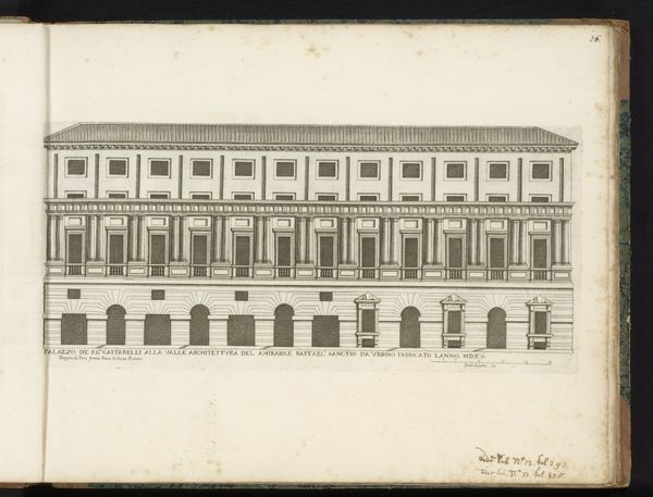 Curator: This delicate engraving presents the Façade van het Lateraans Paleis, dating from after 1655. The artist is Giovanni Battista Falda. Editor: My initial impression is one of almost mathematical precision. It feels very measured, restrained. It's striking how the light is uniform, flattening any sense of depth, as if holding back from expressing a more profound reality. Curator: Indeed. As a print, it functions almost as a blueprint— a kind of promotional document of architectural accomplishment. Notice the repetitive nature of the windows, a feature of Baroque architectural drawing. Editor: That repetition does create a rhythm, but it's a very deliberate one, speaking of authority and order. Look at the building itself: a statement in stone, carefully replicated and disseminated. But what about the inscription at the base, the "Felice Memoria"? Does that provide some clue? Curator: "Eretto di fondamenti dalla felice memoria di Papa Sisto V". Erected from the foundations in happy memory of Pope Sixtus the Fifth. This work honors the legacy of Pope Sixtus, whose ambitious building projects dramatically reshaped Rome. Editor: Ah, Sixtus. So this isn't just a pretty picture; it’s a monument to power, literally built on the memory of a specific figure. The facade becomes a symbol of papal authority. It reflects the kind of confidence the church would like to project. I note Falda meticulously captures the geometry. There's so little that's accidental in rendering this power structure visible. Curator: That’s an excellent observation. This print serves as both documentation and, dare I say, a carefully constructed piece of propaganda. And you know what that makes me wonder... What's omitted from this 'perfect' vision? Editor: Always a good question! Maybe we should see that kind of "perfection" with more critical and weary eyes. Curator: Well said. Editor: A glimpse into what once was— and a good reminder about how we want to remember.