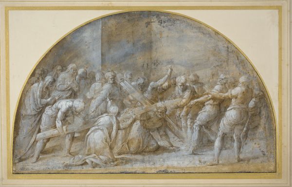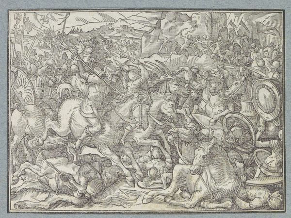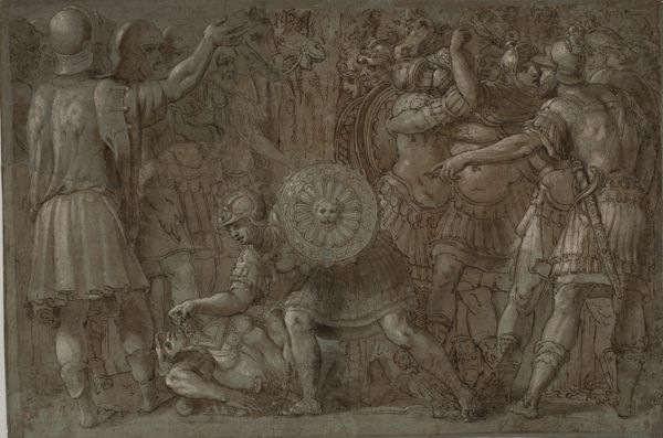 Editor: Here we have a tapestry, "The Sabine Women Stopping the Battle between the Romans and the Sabines," created between 1570 and 1585. It's by Nicolas van Orley and is currently hanging in the Metropolitan Museum of Art. There's so much happening in this weaving. It feels chaotic, almost like a snapshot of a pivotal moment in a really dramatic play. What strikes you when you look at it? Curator: Ah, yes, the organised chaos of Mannerism! It reminds me of the delicious feeling of being utterly overwhelmed, but in a way that's aesthetically pleasing, of course! Look how van Orley managed to fit so many figures into this confined space. They are practically breathing down each other's necks, caught between violence and pleas for peace! Do you get a sense of movement from this still image? Editor: Absolutely, everyone seems to be caught mid-motion, there's real tension, and the women's intervention seems so vital! Curator: It makes you wonder what kind of thread—pun intended!—runs through these historical events and translates them into a powerful visual narrative. What stories are woven in the very fabric of this work, literally! What does the tapestry as a medium add to the drama of this historical scene? Editor: It gives it a sense of formality, perhaps elevates the everyday, domestic action of weaving to something monumental? But given it's black and white, that makes it feel somehow removed or antique! Curator: Indeed! Like holding history right there in your hands. Imagine, all that drama, conflict, and ultimately reconciliation, rendered with the artistry of weaving...a soft contrast to a story of supposed violence. I can almost hear the rhythmic clack of the loom translating tales into thread. And what’s more remarkable is how a textile piece commands authority just like a huge painted artwork in a palace! Editor: That’s a perfect observation to keep in mind – textiles embodying power! I will look differently from now on at them, for sure!
