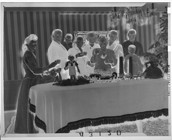 This photograph, titled "Untitled (women wearing and selling corsages)," was created by Robert Burian. The inverted contrast enhances the stark geometry of the window frames behind the women, drawing our attention to the interplay between interior and exterior spaces. The composition is carefully structured, creating a dynamic visual field where the rigid lines of the windows contrast with the organic forms of the women and flowers. This opposition destabilizes our perception, encouraging a deeper reflection on the boundaries between nature and artifice. The women themselves become structural elements, their placement and poses suggesting a layered narrative. The very act of wearing and selling corsages disrupts conventional values of display and commerce, turning them into symbols of social interaction and exchange. This disruption invites us to question fixed categories and consider the fluidity of meaning within social contexts.