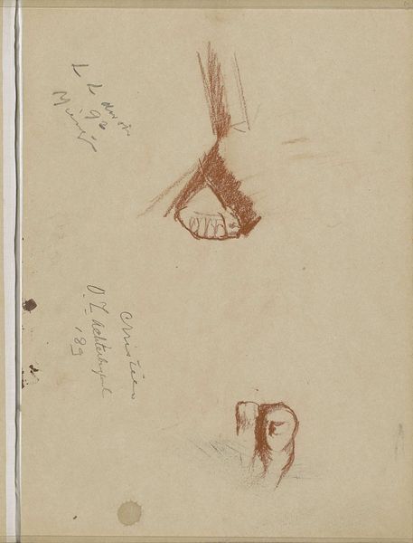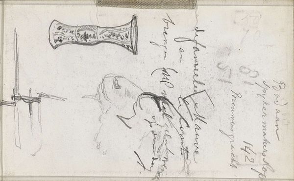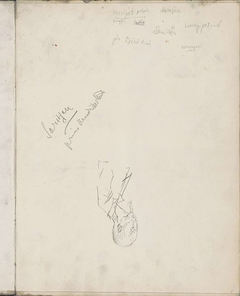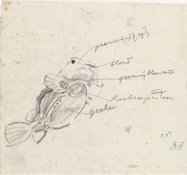 Curator: Looking at Gerrit Willem Dijsselhof's "Studie van de kop en schubben van een vis, met kleurnotities," created sometime between 1876 and 1924, what’s your immediate take? Editor: It's oddly captivating! Raw, almost clinical. The graphite and pencil sketch work really exposes the delicate structures of the fish. It’s the texture that first grabs me. Curator: It is interesting. What strikes me is how such studies provide insight into the artistic process during this period. Dijsselhof used these kinds of sketches to inform his larger designs. Editor: Exactly! He's clearly deeply engaged with the physicality of the fish. The medium serves the message of close observation. Look how he’s handled the light on the scales. How might the accessibility of such simple materials shaped artistic expression? Curator: An important question! The ease of obtaining graphite and paper would have widened artistic opportunities. Dijsselhof worked within the Arts and Crafts movement; there were many proponents in that circle advocating accessible art education and breaking down the traditional high art/craft division. Editor: And you can see this ethos in his approach here. The act of sketching itself becomes a kind of craft, a means of understanding and capturing the natural world. How do we display working drawings like this? Is it displayed for a particular pedagogical intent? Curator: Well, the Rijksmuseum likely holds it as both a study of an artist who made other prominent works and as a resource showing a typical creative process. The sketch's place within his broader oeuvre and its relationship to art historical trends of the time – that's its power here. Editor: The materiality and what we see gives us insight into not only what this artist did and cared about, but how they wanted the art-viewing public to see their practice! It really encourages thinking about art production and what constitutes an artistic creation. Curator: Absolutely. It pulls back the curtain a bit, showing us the thought processes of an artist embedded in a particular cultural and historical moment.