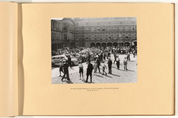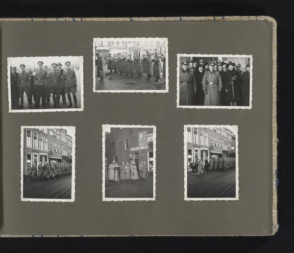 Curator: Here we have a fascinating group portrait titled "Groepsportret van de Amsterdamse Postharmonie," estimated to be from between 1920 and 1940, snapped by Fotocentrale. Editor: Wow, it has an almost militaristic air, doesn’t it? All those uniforms lined up, a sea of serious faces. There's an imposing presence about it. Curator: Yes, there’s a formality that's typical of group portraits of this era, almost a rigid structure. Look closely at the composition—they’re standing in front of a train, emphasizing their connection to postal service and the literal delivery of communications. Editor: Precisely! The railway car really anchors them to the specific labour and system they support. We need to think of the work behind maintaining infrastructure for something as crucial as postal communication—a massive system based on the railways and a whole workforce dedicated to its function! It would also give some context as to why this image was commissioned, presumably. Curator: It's also a beautifully composed print—it captures a moment in time when photography itself was becoming a more accessible and standardized tool, used to document societal structures and workforce camaraderie, however forced it may be! Look at the contrast between light and shadow; the texture on their uniforms. I also get the feeling there is more than just seriousness, but genuine sense of commitment on the faces of the portrayed members. Editor: Consider, too, what went into producing this photograph—the chemicals for developing, the paper itself, all commodities produced within specific social and economic conditions. This isn't just a document; it's an artifact representing a nexus of industrial and social relations! I wonder if all those handsome suits were part of work-provided uniforms, though. Curator: A wonderful point, they really do add to that feeling of uniformity. The photo feels somehow very grounded to time and place because of the almost casual composition. Editor: Ultimately, looking closely reminds us of the tangible labour, material processes, and infrastructure underlying something we often take for granted – how letters made their way from one person to another! Curator: Agreed! It brings to life the often-invisible networks that connected people in the early twentieth century and, somehow, makes you think more deeply about these past human relationships.