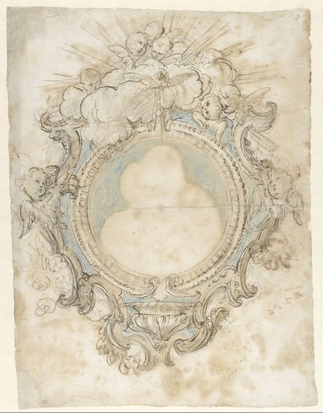Curator: The Rijksmuseum houses this engraving by Jan Goeree, titled "Wapen met een medaillon," dating from about 1680 to 1731. It presents a baroque coat-of-arms embellished with figuration. What's your initial reaction? Editor: Faded grandeur. All the rococo flourishes, putti straining, that heavy cartouche, but the ink is so delicate it gives everything a spectral quality, like looking at a ghost of wealth and status. What about the materials do you think helped create that aesthetic? Curator: The very nature of engraving, a printmaking technique, contributes. Carving those fine lines into a metal plate, then transferring that to paper... it's inherently about replication, dissemination of imagery. Did this heraldic device become reproduced widely? Who was meant to see it? Editor: Exactly. Engraving allowed this message, whether of power or identity, to circulate beyond the elites who'd usually commission something like this in painted form. Plus, we need to consider the paper. It's aged and worn, adding another layer to our interpretation of time, revealing signs of material deterioration from an otherwise controlled context, a marker of its shifting socio-economic position. Curator: And look within the medallion—a figure reclining in a landscape, the text reading "Genetrice," evoking notions of ancestry, maybe even some classical muse? Perhaps whoever this coat of arms represented was striving to project an image of not just power, but also of cultural refinement. Editor: Maybe. Or, look at the labor needed for this detailed engraving - was Goeree also interested in displaying his skill? In turning a more commonplace request, a family's symbolic history, into something resembling High Art, blurring those traditional genre boundaries? It makes me wonder about the artist’s socio-economic background versus that of their patron. Curator: Food for thought, absolutely. And for me, in those delicate lines and the symbolic weight loaded onto such a fragile thing, there's something undeniably poetic, even wistful. Editor: Yes. Perhaps in that contrast—between ambition and delicate execution, lasting social aspirations represented through increasingly less stable and worn physical properties—there exists something almost brutally human about its reach.