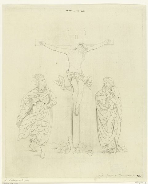 Editor: Here we have Joseph Schlotthauer's pencil drawing, "Christus am Kreuz, mit Maria, Johannes und Maria Magdalena," currently held at the Städel Museum. The stark simplicity really heightens the emotional intensity for me. What immediately captures your attention in terms of formal qualities? Curator: The stark contrast, precisely. Note the artist’s deployment of line to articulate the forms – consider its delicacy defining Christ’s figure against the starkness of the cross. Schlotthauer uses a tightly controlled medium to present complex form and a dramatic moment, which, on closer inspection, complicates any easy reading of grief and mourning. Editor: Complicates? In what way? Curator: Look closely at the figures at the foot of the cross. Their arrangement creates a carefully balanced pyramidal composition that invites the eye to move through each figure individually. They are frozen, nearly, not in expressive lament. Their immobility is what intensifies our contemplation of the Passion. Do you see the artist's geometric reduction of form, particularly in the drapery? Editor: Now that you mention it, their robes do seem quite stylized, almost… sculptural. And you're right; they aren't dramatically mourning. It is so contained and internal. How does the landscape style contribute? Curator: The indistinct, subtly rendered landscape focuses our attention inward, isolating the central figures. Landscape traditionally sets the scene. Here, the minimal details and absence of narrative through line heightens the central, figurative subjects, placing emphasis on the visual structure and allowing for, or perhaps even creating, our own meditation. Editor: I see, the subdued landscape almost forces a concentrated focus on the figures and their careful arrangement. Thank you, I will consider how such geometric composition and the figures’ stasis heightens contemplation. Curator: Indeed. We can clearly understand form without context. Consider how much more there is to learn by way of thoughtful observation.