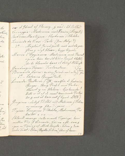 This is a page from Johan Thomas Lundbye's travel journal, likely made during his travels in Milan. It's a humble object: paper, ink, and the simple binding of a notebook. Lundbye wasn't creating a finished artwork here. Instead, he was using the journal as a tool. It was a means to record observations and impressions, almost like a portable extension of his mind. The handwritten text, filled with references to artists and artworks he encountered, shows the work of intellectual labor, of an artist actively engaging with the cultural landscape around him. What's fascinating is how the materiality of the journal itself – its portability, its accessibility – democratizes the artistic process. It's not about high-end materials or elaborate techniques. It's about the act of seeing, recording, and reflecting. The journal reminds us that art isn't just about the finished product, but also about the journey, the process, and the everyday practices that shape an artist's vision. It challenges us to look beyond the traditional boundaries of art and to value the creative labor embedded in even the simplest of objects.