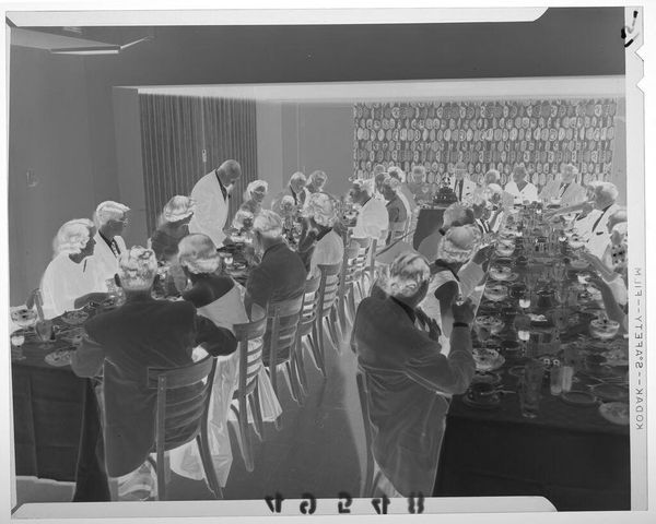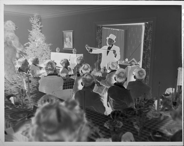 Editor: Here we have an untitled black and white photograph by Lucian and Mary Brown, depicting children eating at long tables at what looks like a cowboy-themed party. The starkness of the black and white really emphasizes the materiality of everything. What stands out to you about the materials and social context of this work? Curator: Well, considering the means of photographic production, we must look at who had access to cameras and film. Who was being photographed, and by whom? This access reveals certain power dynamics and class structures inherent in the act of documentation itself. Editor: So, the labor of creating the photograph, and who gets to participate in that labor, tells us something about society at the time? Curator: Precisely. The photograph becomes a record of consumption, both in the food on the table and in the very act of recording the event. Editor: I hadn't thought about photography as a form of consumption, that's a fascinating perspective!