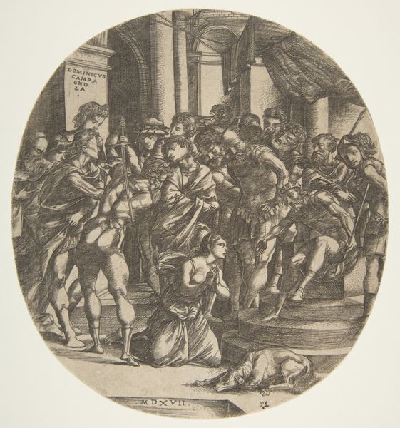 Léon Davent created this print, Wrath, from the 'Seven Deadly Sins' in the mid-16th century. The circular composition is densely packed with figures enacting a scene of violent retribution, all rendered in meticulous detail through engraving. The artist's masterful use of line creates a sense of depth and frenetic energy. The figures are tightly interwoven, their actions converging towards the centre where acts of violence are taking place. Davent uses light and shadow to heighten the dramatic intensity, emphasizing the contorted bodies and anguished expressions of the figures. The architectural backdrop, engulfed in flames, provides a stage for the unfolding drama. The scene challenges conventional notions of justice by highlighting the raw, destructive power of human emotion. The work invites us to reflect on the darker aspects of human nature and the potential consequences of unchecked anger. This is not merely a depiction of violence, but a contemplation on the psychological and societal impacts of wrath.