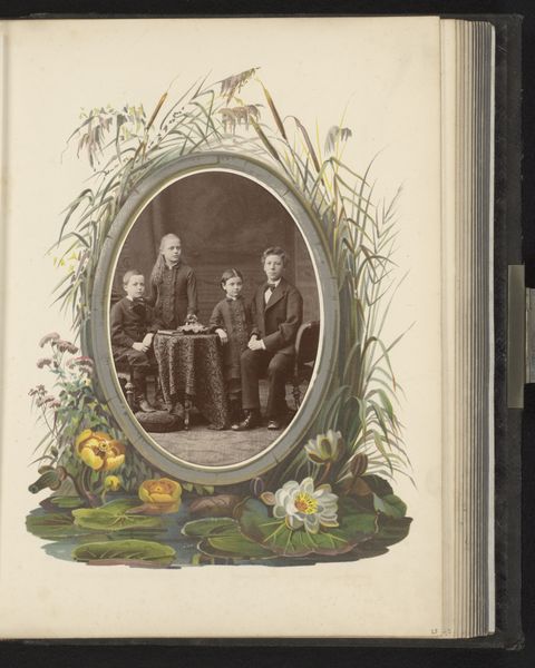 This is a portrait of a man, a woman, and two young girls by Fritz Schumann, made with photography and hand-applied color. It's a window into the past, but also a highly constructed artifact, showing a family from a particular social class. Notice the hand coloring, this was a common technique used to enhance the image. The tinting and the addition of watercolor bring an element of warmth and personality to the photographic print. The added ornamentation gives it a feeling of preciousness. This labor-intensive process reminds us of a time before digital photography, when capturing and preserving memories was a more involved and crafted affair. By engaging with these traditions, the artist has imbued the artwork with cultural significance, as it encapsulates a moment in time, capturing not only the likeness of the subjects, but also a sense of their social standing and cultural values. These elements elevate the photograph beyond a mere family snapshot.
