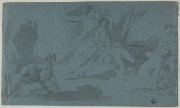 Curator: William Taverner is the artist behind this work; it's a drawing of "Polyphemus Throwing Boulder at Acis, with Galatea," created with pencil and chalk, existing in two versions on the recto and verso sides. What springs to mind for you initially? Editor: Chaos! A storm of bodies, rendered in shades of gray like a fading dream. There’s a raw, kinetic energy, even though it’s just chalk and paper. What about you, any symbolic gut reactions? Curator: Absolutely, the grey palette really highlights a sense of antique tragedy playing out. Polyphemus, in his jealous rage, becomes a primal force. He’s not just throwing a rock; he's attempting to shatter the idyllic union of Acis and Galatea. We often find this narrative, the monstrous interfering with love. It speaks to inherent conflicts present in society. Editor: Yes, he really captures something fundamental, that brutal, possessive side of human nature. The grouping of figures in his depiction certainly enhances that feeling. It has a dreamlike atmosphere, yet so tangible and emotive. The sheer violence contrasts sharply with the delicate lines, almost as if he's tracing something ancient etched deep in the collective psyche. What purpose would these drawings have served for Taverner at the time? Curator: Knowing the date is unclear, we might propose a preliminary sketch towards a grander, potentially unrealized, composition. Taverner’s art often engaged with mythology. Think of Polyphemus as a visual representation of unchecked emotions, while Galatea and Acis represent purity and beauty. We witness it even today; figures, in positions of power abusing that role, becoming almost bestial in their disregard for justice. Editor: So, it’s more than just a story of gods and monsters; it is an enduring representation of destructive obsession, laid bare through simple lines. There is something deeply and uncomfortably human at the center of it all. I’m sure I’ll see it in tomorrow’s news too! Curator: It's a stark reminder of the destructive potential within us, and how these stories, visually coded over centuries, retain their disturbing power. Editor: I guess we can only hope it doesn't repeat, or at least remember the story the next time someone has their hands on a large rock.