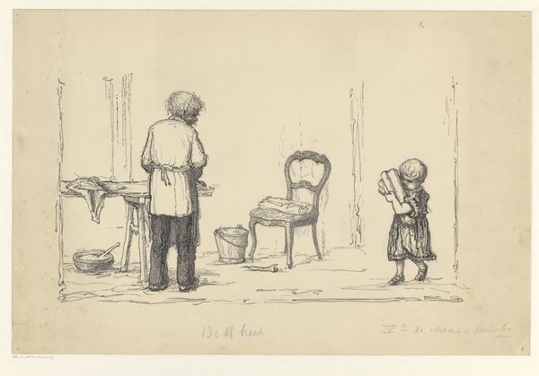 Editor: This is "Two Fishermen on the Beach, One Repairing a Sail," an etching by Egidius Linnig from 1840, currently housed at the Rijksmuseum. The scene has such a feeling of everyday life and labour; what jumps out at you? Curator: I see a powerful emphasis on cyclical nature, reflected through multiple layers of symbolism. Observe how the fishermen mend their nets and sails; they are literally repairing their tools for further acquisition of harvest. What feelings do you get from this constant return? Editor: I think of the changing seasons, each cycle ending and then beginning again. It makes me think about how so many jobs are closely tied to the climate, even today! Curator: Precisely! Linnig is tapping into the deeply embedded symbolism of the sea, of cloth. Notice the way the nets cradle the fish, drawing out life, much as a mother swaddles an infant to protect its vitality. The fisherman is also protecting life when repairing. What else strikes you in this symbolic arrangement? Editor: I didn’t even consider the nets protecting and taking life. The artist draws an explicit connection with what we extract from the ocean to survive and shows us they also try to repair to keep living and working; and what would they repair? It makes it all the more interesting to consider the sea as mother of life in art. Curator: The cycle completes, echoing themes present in classical allegories, myths, and much older narratives; now seeing this connection, how do you feel about it? Editor: It shows that a simple scene contains many layers of deeper historical meanings than previously thought; how even in what seems the most normal setting you can find art in its simplest form. It also makes me look at Linnig and 1840 in a very new way, by realizing this timelessness captured in a mundane image. Curator: Indeed, a window into our timeless pursuit of sustenance, framed within symbolic echoes of the sea.