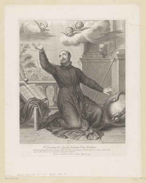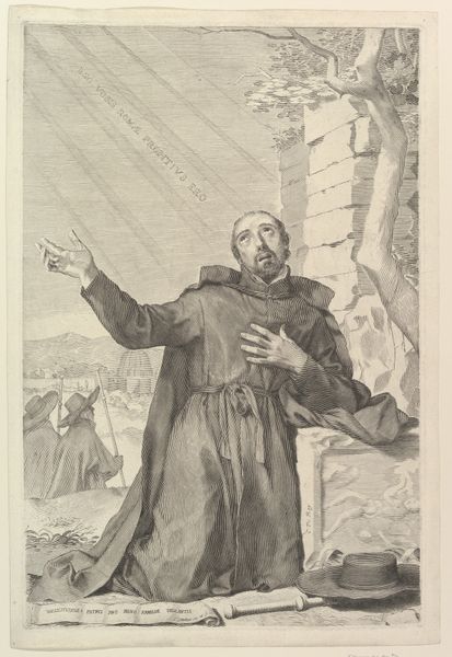 Editor: This is Claude Mellan’s "Saint Ignatius in Ecstasy," from around the 17th century. The linear quality is striking, particularly the way Mellan seems to build form with single, continuous lines. What can you tell us about this engraving? Curator: Notice the emphasis on the printed line itself, created by the burin’s mark upon the metal plate. The image becomes less about spiritual experience and more about the labor involved in its making, and its dissemination as a commodity. Where was this printed, and for what audience? Editor: That's interesting. I was focused on the religious aspects, but you're highlighting the material production. Curator: Exactly. How does understanding the means of production change our interpretation? Is this devotional, or a demonstration of skilled labor? Editor: I see what you mean. Thinking about the process does shift my perspective. Thanks! Curator: Indeed. It brings the hand of the artist, and the social context of its creation, to the forefront.