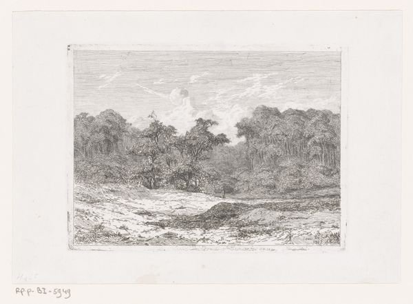 Curator: Let's turn our attention to this tranquil image by César de Cock titled "Doorkijk in het bos," created in 1848. It’s an etching, ink on paper. Editor: My immediate impression is of a meticulously crafted, almost claustrophobic stillness. The tight framing forces my gaze into the depths of the woods. Curator: That sense of depth is key. The “doorkijk,” or view through, typical of Dutch landscape painting, presents the forest as both inviting and impenetrable, resonating with the Romantic era’s fascination with nature's sublimity. Note also, the forest as a space in Germanic mythos and symbolism. Editor: Yes, but how the composition funnels your eye, the deliberate arrangement of light and dark, those areas of dense foliage creating such dramatic chiaroscuro… It almost borders on the theatrical. The surface texture created by the etching technique is quite rich too. Curator: Exactly. And it recalls the persistent Germanic symbols and myths that existed as a constant source of cultural reference from the dark ages into modern cultural memory. Forests carry connotations of shelter, refuge, but also hidden dangers, secrets. This etching would echo potent stories for the people viewing it, wouldn't it? Editor: True, but to look at just the rendering of form, the contrast in textures—the smooth trunks versus the bristling leaves, adds visual intrigue. There’s tension created by this play between clarity and obscurity. Curator: Think about how the trees are portrayed not just as trees, but as individual, almost personified, entities. In Germanic lore, trees were often seen as sacred dwellings, as totems imbued with power. That perspective emphasizes a harmonious relationship between humanity and the natural world, offering spiritual meaning as a continuous element. Editor: I'd add how those linear patterns formed from the ink give everything, especially in the foreground, an intense, tactile quality. Curator: Ultimately, de Cock presents us with a landscape that functions both as a physical place and a mirror reflecting the psychological states and collective memories linked with wild nature. Editor: Yes. By looking at the composition we are made more aware of how that psychological symbolism enters our awareness. Curator: A potent combination indeed!