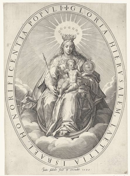This is Cornelis Bloemaert’s "Madonna zittend op de maansikkel" from the 17th century, rendered with fine lines in an engraving. The composition immediately draws your eye to the Madonna and Child, framed by a radiant halo and seated upon a crescent moon. Notice how Bloemaert uses line and form to create a sense of ethereal weight. The Madonna's robes are voluminous, yet the delicate lines keep the figure from feeling heavy. The radiating lines of the halo, contrasted with the solid form of the moon, create a visual tension, destabilizing our sense of space. The Madonna as ‘seated on the moon’ elevates her, challenging earthly constraints. Consider the semiotic implications of the crescent moon beneath her feet, traditionally a symbol of the Virgin Mary’s purity and dominion. Yet, here, it also serves as a structural base, literally supporting the central figure. This detail invites us to reflect on how religious symbols can simultaneously reinforce and transcend established meanings.