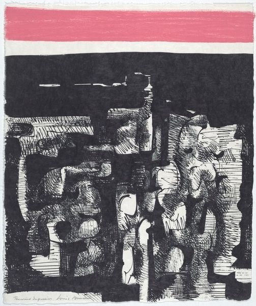 Curator: Eileen Agar's mixed media collage, "Beetles and Hand," presents us with an intriguing visual arrangement. The drawing combines ink, watercolor and collage, mounted within a strong blue frame. Editor: Instantly, there’s a feeling of both delicacy and… impending doom, maybe? That hand, reaching up from the abyss, contrasting with the entomological study above. It's like a scientist's nightmare. Curator: The composition relies on contrasting textures and forms, foregrounding the stylized hand, rendered in stark black, its curves echoed in the delicate rendering of beetles amongst foliage in the middle ground. Note how Agar uses collage to construct the ground upon which these forms reside; how do you see this playing with modernist concerns? Editor: Playing with! I see it as an assertion. That jagged edge of collage, slicing through the otherwise ‘orderly’ botanical illustration of beetles, feels like a rebellious tear in the fabric of reality, of what’s knowable. The contrast is not merely aesthetic; it’s disruptive. Curator: A disruption that pushes toward the unconscious, no doubt influenced by Surrealist principles of her time. The work’s juxtaposition and disorienting scales destabilize any fixed narrative. Editor: Exactly! My mind races toward ancient myths, forbidden knowledge. Is the hand reaching to grasp the secret of the beetles, a dark natural science? Or is it being repelled? The dream logic Agar employs so well really opens up all those fun, scary doors. Curator: Certainly the unsettling feeling stems from the ambiguity of relationships within the composition; its beauty invites an exploration of the dialectical images present: life and death, beauty and the grotesque, rational order and psychic fragmentation. Editor: Ultimately, it’s the vulnerability captured in that poised reach and crawling carapace. These beetles might be armored, and that hand imposing in shadow, but they each feel precariously balanced. You could breathe on them, and the whole scene would unravel, you know? A wonderful piece!