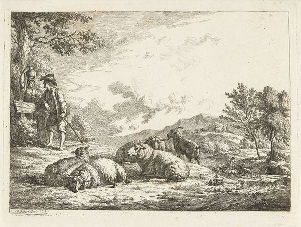 Curator: This is Isaac Weissenbruch's "Poor Family Walking on a Country Road," likely created sometime between 1836 and 1912. It's a pencil drawing, possibly prepared for engraving, and currently held at the Rijksmuseum. What strikes you immediately? Editor: It’s somber, certainly. The grayscale palette enhances the feeling of hardship; their journey appears arduous. What was it like to be one of those family members who were always exposed on these travels, in all elements? Curator: That emotional weight speaks directly to Weissenbruch's grounding in realist traditions. His choice of everyday subject matter elevates the previously unexamined lives of working class families. Consider, too, the broader 19th-century context: urbanization, industrial upheaval, and its subsequent effects on the marginalized. The very act of depicting this family constitutes a potent social commentary, giving dignity to the otherwise invisible. Editor: Indeed, you can see it's the family unit that's providing structure when facing all these larger forces that might push them apart, so how is the artist representing this reality? I’m intrigued by the use of pencil and what looks to be preparation for print. There’s an inherent connection here to accessibility and reproducibility, wouldn't you agree? This suggests the intent was to disseminate the image widely, amplifying the family’s plight across social strata. Curator: Exactly. The decision to employ a medium suited for mass production transforms it into a statement about access, challenging traditional art boundaries and the elite's monopoly on visual culture. Think about how distribution shapes perceptions. Editor: Right, but what are we not seeing about the labor involved here? There is that element as well: both what is represented, this family unit surviving and traveling, and the artist's time and toil that we now simply consume without considering its value in material terms. What kind of work would be expected to pay off in that time for an artist working in the city? Curator: That kind of reading provides insight into the production networks themselves, how this artist functions as a worker inside their economic and historical moment. By turning to philosophies, like those espoused by Marx, it can expand what an artistic representation means by calling attention to value creation under duress. Editor: Seeing Weissenbruch’s drawing and examining his media helps reveal those underlying truths, wouldn't you say? To see is to start engaging. Curator: Absolutely. Understanding how "Arm gezin lopend op een landweg" intertwines medium, message, and historical circumstance allows us a better look at intersectionality itself. Editor: In the end, these quiet portraits capture the experience of work and give insight into history in unique ways.