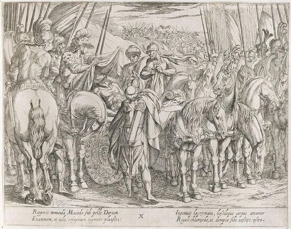 Curator: This is Antonio Tempesta's "Procession of the Pope to St. John Lateran." Editor: It's a very busy scene! I'm immediately struck by the repetitive use of line to depict the numerous figures on horseback. Curator: Right, Tempesta, born in 1555, was known for his prolific printmaking. The linear quality comes from the etching process itself, influencing how we perceive the subject. Editor: Considering the era, the meticulous detail suggests a certain reverence for the event, yet the print also feels like a commodity made for wider distribution. How was this imagery consumed? Curator: These prints would have circulated widely, shaping perceptions of power and religious spectacle. It's about more than just devotional art, it's the business of image-making. Editor: A reminder that art is rarely divorced from its means of production and its role in the broader social landscape. It makes you consider who had access to these images. Curator: Precisely. Examining the materials and distribution reveals much about its cultural impact. Editor: Indeed, thinking about the intersection of faith, power, and the market for images gives me much to ponder.