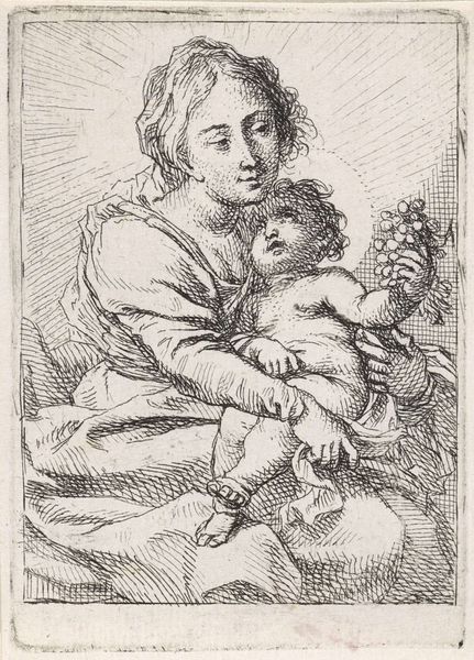 Editor: So, here we have "Maria with Child and a Pear," an etching and engraving print crafted somewhere between 1625 and 1674 by Jan Lievens. The work, held at the Rijksmuseum, shows Mary gazing down at a sleepy baby Jesus while holding up a piece of fruit. It feels so intimate, almost like we're intruding on a private moment. What strikes you about this piece? Curator: That's a lovely sentiment! Intimacy is exactly what Lievens captures, isn’t it? For me, it's the pear that whispers secrets. In Dutch Golden Age art, fruit often symbolizes abundance, but also the Fall from grace, the knowledge of good and evil. Could Lievens be hinting at the future suffering and sacrifice of Christ, even amidst this tenderness? Do you see the delicate lines of the etching – they remind me of a mother’s touch, gentle yet firm. It is like a dance of light and shadow that evokes the era's history. What era would you compare it to, and how might those artistic influences converge or diverge from that period? Editor: It's so interesting that you noticed those themes. I've been diving into some gothic art and thought it resembles that due to the era, light, shadow, etc. Although I now believe it to be Baroque. I never really considered religious context while analyzing portraits. Do you think that, generally, religion plays an essential role in old artworks, or is it rather an implicit feature? Curator: An excellent question! Religion in old artworks isn't always a screaming headline, but more like a heartbeat, subtly shaping the rhythm and flow. It's the air they breathed, influencing their worldview, even if a piece isn't overtly religious. It's often implicit, shaping the iconography and meaning embedded in everyday scenes. You begin to read symbols once you grasp a bit about the cultural background, it becomes far more meaningful to know and witness all that is being displayed, not simply admire. Editor: It’s been helpful learning more about the time frame this came from, that allows for a greater understanding and perspective. It feels like I've unlocked a new level in understanding these paintings, making what was implicit, more explicit. Curator: Exactly, like discovering a hidden verse in a well-loved song. Art history does that – enriches the melody.