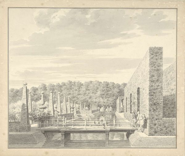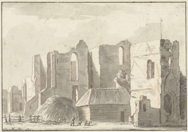 Josephus Augustus Knip created this drawing, "The Baths of Caracalla and Three Capitals from the Villa Mattei in Rome," using pen, brush, and gray ink. The panoramic composition is striking, unfolding the ruins across a wide horizontal plane. Note how Knip uses a muted palette, primarily shades of gray, to evoke a sense of antiquity and solemnity. This monochromatic approach emphasizes form and structure, allowing us to focus on the architectural decay and the interplay of light and shadow. Knip's strategic use of line and perspective draws the viewer's eye through the scene, creating depth and a sense of vastness. The ruins are not merely depicted but are structured as a series of receding planes, each carefully rendered to suggest both mass and decay. This approach destabilizes traditional landscape art, turning it into an archaeological study. The overall effect is a meditation on time and the transience of human endeavor.