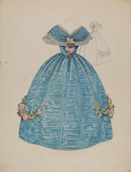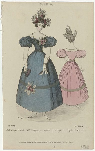 Curator: Let's discuss this fashion plate, "Les Modes Parisiennes, juin 1850: Lingeries" currently housed in the Rijksmuseum. It presents an aesthetic ideal heavily steeped in the social stratification of mid-19th century Paris. Editor: The delicacy is remarkable! I see immediately the texture of the fabrics rendered by etching with such precise lines. The emphasis on craft suggests the rising industrial textile production simultaneously enabling and threatening handmade luxury. Curator: Exactly. Look closely; it presents both a mother figure in an elaborate dress, flanked by two children, seemingly offering flowers. These gendered roles, these constructed intimacies, are reinforced by very deliberate visual cues like clothing, accessories, and posture. The whole image reinforces the idea of the woman as the center of a domestic, yet fashionable world. Editor: Absolutely. The artist makes material production quite clear with the detailed studies above the scene. Lace was especially important; the kind of detail that demands skillful, laborious handiwork while simultaneously referencing the larger economic system which produced, distributed, and consumed it. Do you think that juxtaposition might emphasize the commercial aspect more than the maternal? Curator: It's a difficult line to draw, isn't it? While the imagery does offer insight into family roles and how these roles were carefully designed, it primarily functioned as advertisement for the wealthy woman's sartorial life. It presents "femininity" as something produced, purchased, and performed, deeply embedded in broader structures of power. What does it mean, then, for those who could not afford to perform it? Editor: This type of image served not only to present these specific fashions but the very concept of high fashion as an exclusive experience to consume. Even the lingeries denote both intimate care, labour, and the wearer’s implied comfort and idleness, revealing the nature of work within domestic space. Curator: A very apt analysis. The lingeries’ presence underlines the commodification of both labor and intimate moments within the social milieu of mid-19th century Paris. Editor: Precisely. I’m constantly amazed by the levels of information we gain by approaching seemingly decorative work in this manner. Curator: As am I! Examining the work through socio-historical and material lenses, allows us to see its many layers, even today.