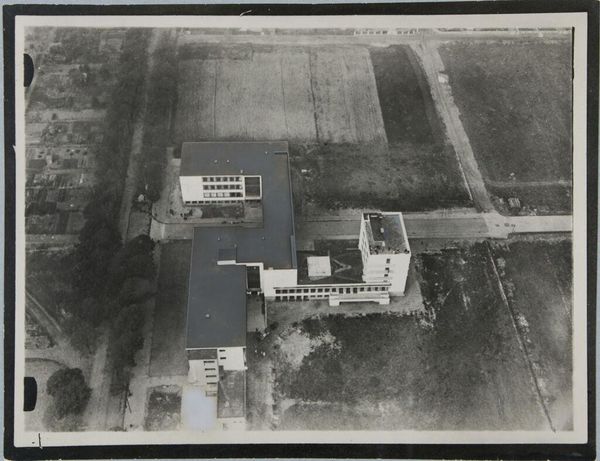 Editor: This is a photograph titled "Sroenie," created between 1931 and 1934 by an artist from Atelier Kurkdjian. It's on paper, giving it a fragile and aged quality. I’m struck by the bird's-eye perspective – it feels strangely detached. What do you see in this piece? Curator: Indeed, that aerial perspective is key. What emotional impact does this ‘god’s eye view’ create, juxtaposed with the image itself, which seems to depict industry amidst agrarian lands? Consider what industry represented at this time, its promise and its psychological cost. Editor: It does feel a bit bleak, seeing this industrial complex nestled in what looks like farmland. Was this kind of image meant to convey something specific? Curator: The symbolic contrast is palpable, wouldn’t you agree? Note how the desaturated tones create a sense of timelessness, yet also detachment. Do you feel this visual tension reveals a deeper cultural narrative concerning progress and nature? Think about similar images from the interwar period – what recurring motifs do you notice, and what might these reflect about collective anxieties and aspirations? Editor: I guess the artist is making a statement about industrial growth, and its impact on the environment. This almost clinical approach removes any sense of romanticism. Curator: Precisely! This dispassionate representation of factories amidst fields serves as a potent commentary. Notice how even the use of paper reinforces this theme – a seemingly delicate medium bearing an image of imposing industry. Now, does your perception of the artwork change when viewed as an intersection of opposing cultural symbols frozen in time? Editor: Definitely. The aged paper adds another layer, like looking at a historical document, or evidence of change. Curator: It becomes a lens through which we can interpret shifts in cultural memory. Editor: I see it now – not just an image, but a convergence of ideas about progress, place, and perspective. Thanks for that!
