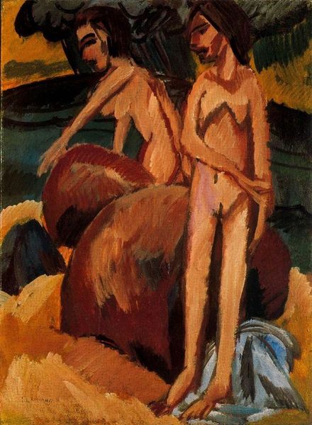 Editor: So here we have Ernst Ludwig Kirchner’s "Two Bathers," painted in 1912, using oil on canvas. The vibrant blues and pinks create a somewhat unsettling yet captivating scene. What do you make of it? Curator: Kirchner’s work often throws us into a world of intense emotion and social commentary. Looking at this piece through the lens of its time, early 20th century Germany, how do you think anxieties around modernity, industrialization, and changing social roles are being expressed, particularly regarding gender and the female form? Editor: I see what you mean. There’s something almost aggressive in the way the figures are rendered – they’re not idealized, but angular and almost harsh. The colours are definitely jarring. Curator: Exactly! And consider the Expressionist movement as a whole. They were reacting against academic tradition, searching for a raw, authentic representation of inner experience. These figures are nude but certainly not classical nudes, the female bodies are presented in such a way that it reflects this kind of turn toward raw, unfiltered feeling. The figures’ gazes are turned away, lost in some way. What effect does that have on the viewer? Editor: It definitely creates a sense of disconnect. Like we’re observing a private moment, but also a moment of perhaps unease. It makes me consider my role as a viewer, peering in. Curator: Precisely. Kirchner challenges us to confront uncomfortable truths about the self and society, by destabilising how we’re used to seeing women represented in art. He captures the alienation and fractured identities so present in the build up to the First World War. Editor: That's a lot to consider; I can see how social context really shifts how we interpret even the figures themselves. Thank you. Curator: Absolutely, context allows us to really grapple with the artwork!