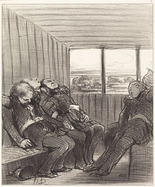 Honoré Daumier created "Un Premier voyage en chemin de fer," a lithograph, capturing a moment inside a train carriage. The figures are tightly packed, defined by sharp lines and a monochromatic palette, evoking a sense of claustrophobia. Daumier uses caricature to emphasize the emotional impact of this new mode of transport. The contrast between the apprehensive expressions of the passengers and the detached indifference of the man on the right suggests broader anxieties about industrial progress and its effects on human experience. The composition directs our gaze to the window, hinting at the external world rushing past, unseen by those consumed by fear and discomfort. The lithograph's starkness isn't merely descriptive, but it critically engages with the social and psychological dimensions of modernity. This print challenges us to reflect on how technological advancements shape and reshape our perceptions and anxieties.