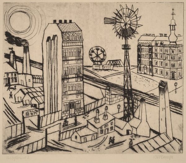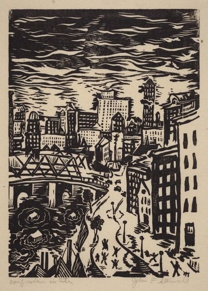 Editor: This is "West Side, Chicago," a woodcut print made in 1938 by William Jacobs. It depicts a dense urban landscape. It feels both bleak and energetic. What do you see in this piece? Curator: I see a stark visual representation of the pre-war American urban experience. Consider the date, 1938. This was a time of economic depression and social upheaval, particularly affecting the working class and marginalized communities who often populated these dense urban centers. What do you notice about the composition itself? Editor: The buildings are tightly packed, and there are tiny figures climbing what looks like a long outdoor staircase... Almost like they are climbing the buildings. The dark, heavy clouds add a sense of foreboding. Curator: Exactly. Jacobs is likely commenting on the social and economic conditions of the time. The stark black and white contrasts could symbolize the inequalities and divisions within the city, between the wealthy and working class. And who had access to the so-called American Dream? Editor: It is interesting how the upward-moving lines of the staircase create movement through the scene. Like they are pushing past that heavy, ominous feeling. It definitely prompts reflection on who has a way up. Curator: And don't overlook the Regionalist style. These artists were looking to depict uniquely American subjects, not through a European lens. In that regard, do you feel it critiques or celebrates Chicago and its citizens? Editor: Hmm... It is a complicated narrative of striving and confinement. I see both criticism and an acknowledgement of the everyday lives of Chicago residents. Curator: Precisely. Art provides powerful insights into societal structures and lived experiences and this work can continue to fuel important conversations today. Editor: I'll definitely look at other Regionalist works with this in mind! Thanks!