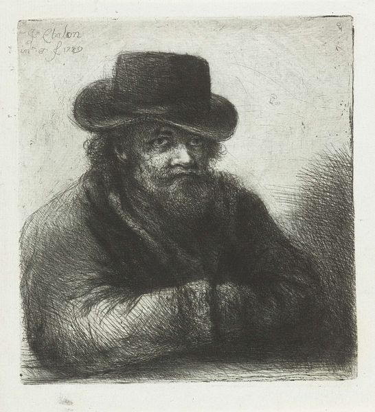 Jan Chalon created this etching of an old man with a turban in the late 18th century. The Netherlands, at this time, was experiencing the Enlightenment, and art reflected the era's interest in observation and the study of human nature. Chalon's work evokes the detailed character studies of Rembrandt. But while Rembrandt captured the inner lives of his subjects, Chalon’s image feels more like a type. The ‘Oriental’ turban, a symbol of the exotic, was fashionable in European portraiture, but here its slightly absurd placement adds a theatrical air. Was Chalon commenting on the superficial adoption of foreign cultures by the Dutch elite? Perhaps the old man represents wisdom, or, conversely, the follies of age. These questions remind us that art gains meaning from its time. By researching the visual culture of the 18th-century Netherlands, and considering the institutions that shaped artistic production, we can understand the complex social messages embedded in this small but intriguing print.