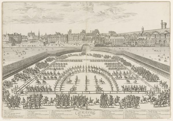 Pieter van den Berge made this print of the Paleisplein in Lisbon, using etching and engraving, common reproductive techniques of the 17th and 18th centuries. The print's material qualities are crucial to understanding its social context. Its lines are precise, delineating the architecture of power and the organized spectacle of the event. The scene captures a public celebration outside the Royal Palace, likely a bullfight, judging by the text below the image. Note how the tiers of spectators are carefully arranged, reflecting a rigid social hierarchy with the elite prominently displayed. The very act of creating and distributing this print speaks to a burgeoning culture of consumption. By producing an easily reproducible image, Van den Berge tapped into a market eager for glimpses of royal life and exotic locales. The print transforms a unique event into a commodity, reflecting early capitalism's ability to package and sell experiences, reinforcing social structures through its depiction of power and order.