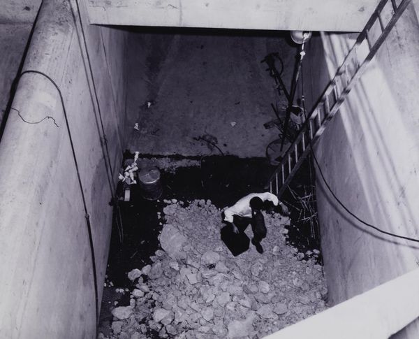 Bas Jan Ader made this photograph, titled "Tea Party", using a cardboard box, a branch, and what appears to be a full tea service. The box, likely sourced from everyday life and mass production, is upended and precariously held aloft by a simple stick. This crude structure contrasts sharply with the refined scene it shelters: Ader himself, dressed in a suit, enjoying tea. The juxtaposition of the mundane cardboard and the genteel tea party creates a deliberate tension, highlighting the absurdity of the situation. This image also encourages us to think about how work and class appear in it: here is this artist, in the setting of a forest, creating a parody or a humorous critique, through a photograph. By drawing attention to these materials and the act of making, Ader challenges traditional distinctions between fine art and everyday experience.