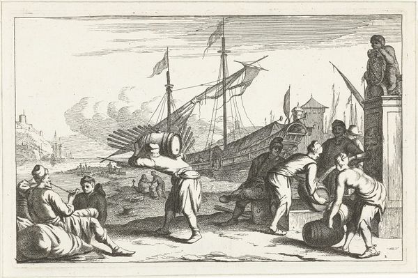 Curator: Look at this intricate etching, “Capricci di varie battaglie” by Johann Wilhelm Baur, created around 1635. What’s your initial read of it? Editor: A chaotic transfer… almost clandestine, with these looming ships in the background and a mix of urgency and weariness on the figures' faces. It has this oppressive air of military movement, which can also suggest power and displacement at the same time. Curator: Yes, there's certainly an overwhelming mood, built primarily through Baur's technique, those very fine, dense lines giving it all a tremendous visual complexity. We see figures being ferried from ship to shore. And then we see the suggestion of larger societal struggles, conveyed through visual tension. Editor: Exactly! Consider the symbolism—the ships as agents of exploration and oppression, the figures caught between these spaces embodying that moment when control changes hands. Are they prisoners, merchants, reinforcements? The ambiguity itself is powerful. It speaks to how ordinary lives become caught in larger geopolitical shifts. And don't forget how the landscape frames that struggle, dwarfing the human figure. It emphasizes who benefits, who doesn't and at whose expense that shift happened. Curator: Absolutely. It invites viewers to unpack allusions. In terms of imagery, notice, for example, the costumes. Each style indexes very specific military and mercantile powers from that time. Do you feel that also plays into the visual dialogue, reinforcing the weight of specific memory here? Editor: Absolutely. Baur deliberately employs these recognisable cues to provoke deeper considerations about national conflicts and economic ambition. The detail seems to shout for some call to action but there are far too few individuals, their postures showing little drive… but instead seem forced? Is this the reality of the conflict we speak of, not bold soldiers, just everyday individuals with other dreams than conflict? Curator: An interesting idea. Through those elements, the artwork reveals the complexities of this transition period during this early 17th century history. What an extraordinary statement, conveyed simply through line and form. Editor: Indeed. I find it impactful how Baur interweaves these grand historical narratives into very human moments, prompting reflection on the lasting reverberations of conflict. The past echoes within our present— and in all futures that follow too.