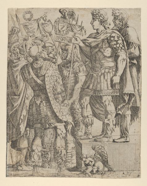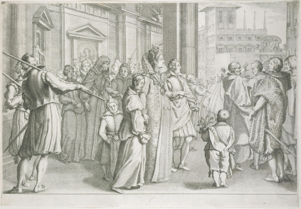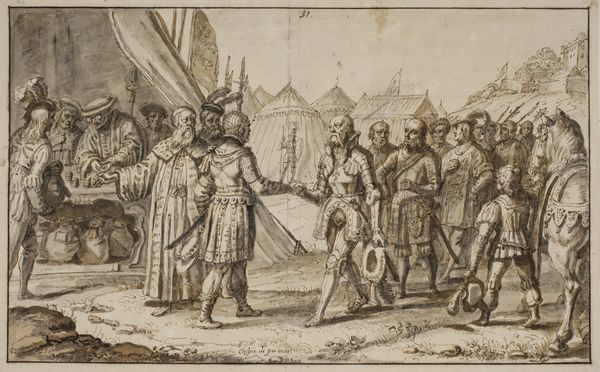 Editor: This is "Otto von Wittelsbach Liberates the Army from a Mountain Pass near Verona," an ink drawing made by Peter Candid sometime between 1560 and 1628. The line work creates this slightly chaotic scene; there are figures everywhere! What visual clues stand out to you? Curator: Immediately, I see the layered effect created by the mountains and the advancing army. It speaks to the overwhelming power dynamics at play in historical narratives. Note how Candid uses linear perspective to guide our eyes from the defined foreground figures into the almost ghostlike retreating army depicted far in the background, seemingly caught mid-retreat within a fortified mountain pass. This visual choice represents cultural memory, as the act of "liberating" can shift depending on whose story is being told and by whom. Editor: You make it sound like liberation is a flexible term! The clothing of the central figures is quite eye-catching. Is there significance to what they are wearing? Curator: Precisely. The elaborate armor and feathered helmets are not merely decorative; they visually signify authority and power, key iconography in the construction of leadership, a signal not only of wealth but of readiness for conflict. Notice how Candid painstakingly renders this detail in the primary figures, contrasted by the rough sketch work of those in retreat, creating a clear visual hierarchy of who the intended hero is versus the chaotic mob escaping peril. Who would you assume this work to have been commissioned by and for? Editor: Hmm, someone hoping to connect themselves to ideas of heroism and leadership, perhaps? Is that why Otto is so prominently placed, liberating those who would likely not have escaped otherwise? Curator: Indeed. Consider the title. It carefully frames Otto’s actions in the best possible light. This isn’t just an image; it's a meticulously constructed piece of political iconography designed to shape historical memory through powerful visual cues. This approach leaves the viewer considering which army truly requires liberation. Editor: I hadn’t considered it in such depth. Seeing the deliberate choices in imagery and their persuasive possibilities makes me look at historical art in an entirely new way!