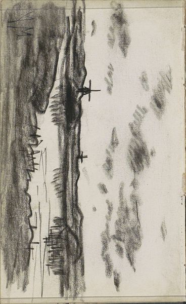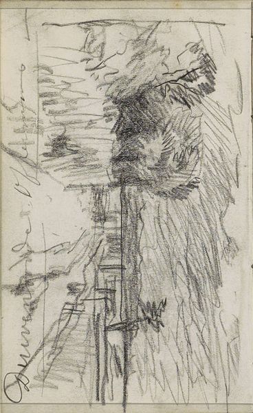 Editor: So, this is "Standing Figure in a Landscape with Trees and a Mill" by Anton Mauve, created sometime between 1848 and 1888. It's a pencil drawing. I’m really drawn to the sketch-like quality, the lines giving a sense of the transient moment. How do you interpret this work? Curator: This sketch provides insight into the artistic culture of the late 19th century. We see Mauve grappling with Realism's demand for accurate observation, but also pushing against it. It prompts questions: who was this figure? Where were they going? Was Mauve documenting a changing landscape impacted by industrial advancements like the mill? Editor: The composition really emphasizes the height of the trees and the mill, making the figure seem small. Curator: Precisely. Think about the rise of landscape painting’s popularity then. Artists sought to capture the essence of nature, but the inclusion of a lone figure also speaks to humanity's place within that vastness. Consider too, the societal context of increasing urbanization. Perhaps the figure embodies a nostalgic yearning for rural life, idealized against the backdrop of industrial change. Editor: That's a perspective I hadn't fully considered – this tension between nature and industry reflected through the solitary figure. Curator: How might this drawing, now in the Rijksmuseum, have been viewed differently when it was created versus today, exhibited within the institutional framework of a museum? Its meaning shifts depending on its audience and place. Editor: It’s interesting how a simple sketch can open up so many different viewpoints about society and its relationship with art. Thank you. Curator: Indeed. It encourages us to question not only what the artist intended, but how art continues to resonate—or change—over time and through various institutional settings.
