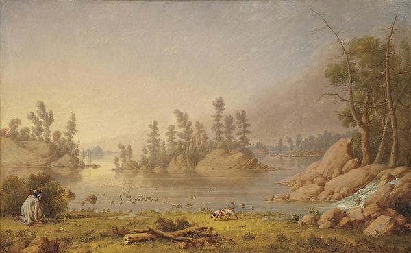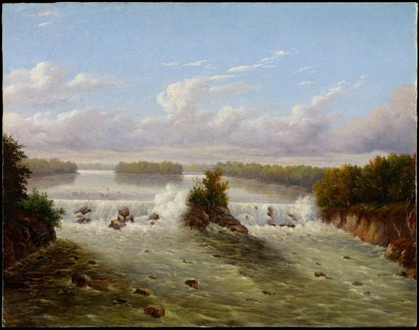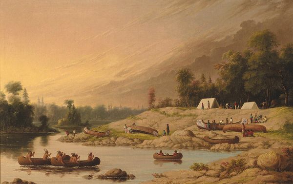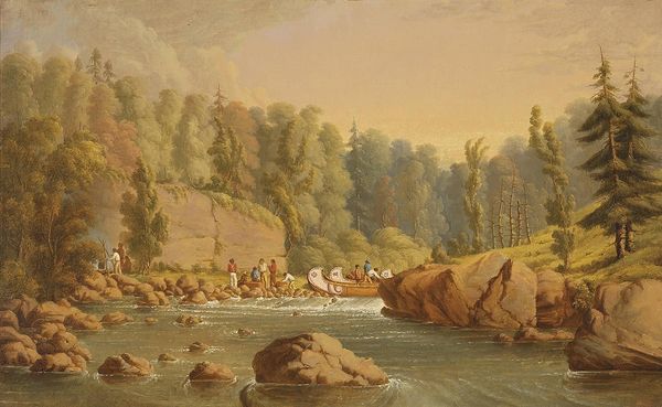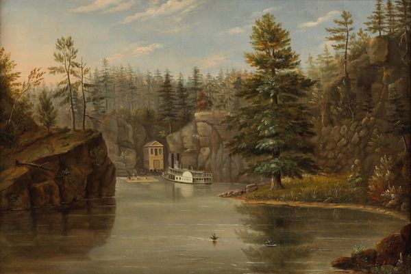 Curator: Sobering is my initial reaction to this river scene—particularly the artist's use of diffused light and earth tones, which create a sense of quietude. Editor: We are looking at "Cheever's Mill on the St. Croix River," an oil-on-canvas painting created in 1847 by Henry Lewis. This work is a superb example of the Hudson River School's dedication to depicting the American landscape. Lewis places this mill within a specific environmental and economic framework. Consider the rapid industrialization occurring and how this portrayal connects to the socio-economic transformations of the time. The presence of figures in boats and on the shore highlights the interplay between nature and human activity, echoing themes of expansion and labor. Curator: The composition is striking, undeniably. The artist contrasts the wildness of the river's current with the ordered structure of the mill itself. The subtle color choices enhance the textures, from the rocky face of the cliff to the smooth wood of the buildings, which seems to root the buildings and give it grounding. The water seems a powerful element, and a possible threat. Editor: And within that powerful element, consider labor practices: what does it mean for some to thrive and others to barely survive based on geography, class and power? While some argue for an untarnished nature, others would emphasize the dispossession enacted on Indigenous land. What could a postcolonial perspective reveal, for example? What is left out? Curator: The semiotic readings could fill a book! The careful use of light draws my eye around the image: from the shadowed rocks to the sunlit buildings to the wispy clouds in the distance—effectively creating a harmonious yet intriguing viewing experience. Editor: I see it differently. It reflects the myth of American progress—at what cost does nature give way to man-made structures? Where is any mention of those whose ancestral lands this mill now occupies? The land holds a painful history of exploitation and displacement. Curator: Certainly the perspective changes the work itself. I have considered formal structure, while you advocate considering it through various filters, race, labor. Editor: We can’t separate our history from the present, and that always influences how we view and depict artwork. We see through different, equally valuable, lenses.