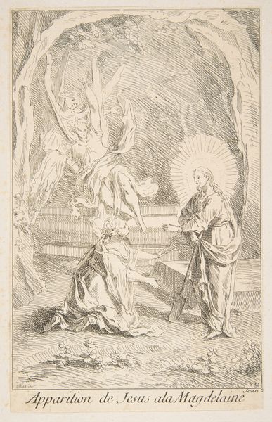 Editor: So this etching by Claude Gillot, titled "Annunciation," created sometime between 1685 and 1722, presents a really delicate and ethereal take on the biblical scene. I'm struck by the artist's choice to render such a momentous occasion with what appears to be such light and fragile lines. What kind of symbols do you see at play here? Curator: This image speaks volumes through its established visual vocabulary. Note the dove, positioned between Mary and the host of cherubs; it symbolizes the Holy Spirit, a visual shorthand recognized for centuries. The angel Gabriel’s gesture is not merely a greeting but an invocation, directing divine energy. Notice the ladder - do you recognize this as an explicit symbol? Editor: I see it… is it Jacob's ladder? Signifying a connection between heaven and earth? Curator: Precisely. It is less about a literal depiction and more about layering symbolic elements to communicate theological concepts. Consider, too, how light is handled – radiating from the dove, illuminating Mary. How might light function symbolically in this work? Editor: It definitely seems to signify divine grace, almost highlighting her acceptance of her role. The figures in the sky look like cherubs floating above, looking down almost as if overseeing what is going on, so many gazes focusing in. Curator: This composition also echoes the concept of collective witness; we, the viewers, become additional witnesses. Gillot, therefore, employs not just symbolic, but psychological cues. Do you think the angel appearing on the ladder rather than the floor, relates to the symbolism, creating an artistic rendition that communicates something beyond words? Editor: That’s really insightful; I hadn’t thought about the artist using the ladder in this specific setting in that way. Now I see how Gillot uses all these familiar religious elements to enhance the emotional resonance, which provides a glimpse into 17th-century spiritual understanding. Curator: Exactly. We’ve moved beyond the literal, connecting with cultural memory and its continuous reinterpretation through visual language. It’s rewarding to decode and consider its implications.