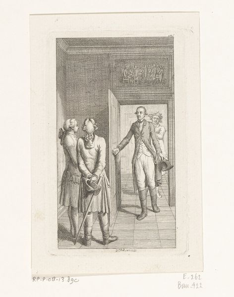 Editor: Here we have "E he ha hi hi, ja ik ben groot genoeg (dagboek, 31 augustus)," created between 1805 and 1808 by Christiaan Andriessen. It’s a pen and ink drawing on paper depicting a domestic scene. There's something both intimate and strangely distant about it. What strikes you about this piece? Curator: What I find compelling is how this simple domestic scene reveals the social structures of the time. The drawing style suggests the intimacy of Romanticism, yet the rigid social hierarchy is subtly present. Notice the distinct roles and positioning of the figures. Editor: The man's back is to us, almost barring our entry into the scene. And the woman standing by the fireplace, she seems isolated despite being in the same room. Was this typical for depictions of domestic life back then? Curator: Often, genre paintings served as moral instruction but also functioned as documents of daily life. Andriessen’s work is interesting because it seems less about overt moralizing and more about observing, almost like a snapshot of middle-class Dutch society. The roles within the family are defined—the man as the potential provider, the women possibly overseeing domestic duties. What do you make of the almost theatrical arrangement of the figures? Editor: It does feel staged, doesn't it? Like they're performing roles. Almost as if Andriessen is subtly critiquing these social expectations rather than just documenting them. Curator: Precisely! Consider how the rise of the middle class influenced art. Artists sought to capture their lives, but were also influenced by societal norms and the market for such works. Andriessen balances portraying domestic life with commenting on it, perhaps unconsciously. It makes us question whose perspective we are seeing, doesn't it? Editor: Definitely! It gives you a lot to think about. I came in seeing a simple scene but now it feels like there are layers beneath the surface! Curator: It shows how art always reflects broader social dynamics, even when seemingly focused on intimate moments. I appreciate you highlighting this hidden complexity!